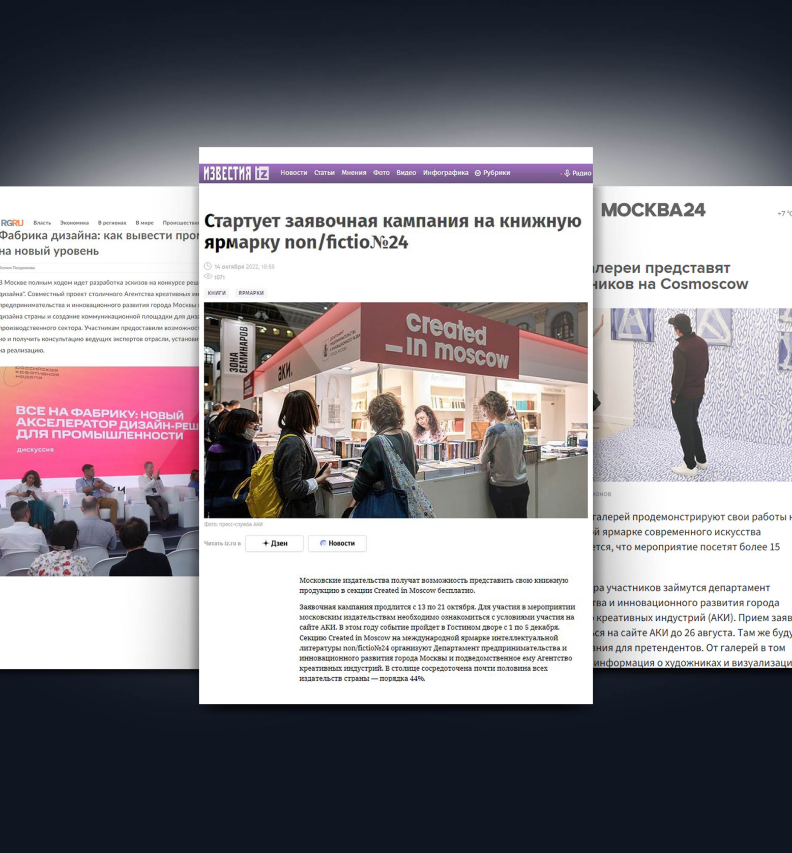 Также реализовано 10+ информационных кампаний по освещению проектов АКИ и мероприятий с участием агентства, в числе которых Дизайн-цех, АРТ-Фабрика, Фабрика музыки, Академия музыки, Российская Креативная неделя, Неделя моды, магазин «Телеграф», non/Fiction, Cosmoscow, blazar и др.