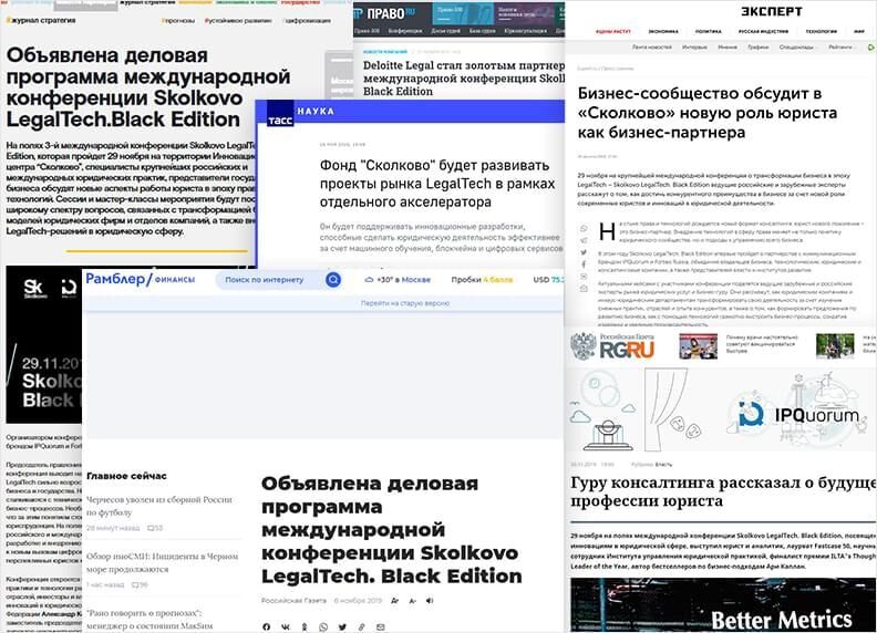 - проведено комплексное освещение в СМИ и на публичных ресурсах интернет Skolkovo LegalTech.Black Edition: анонсирование, репортажное сопровождение, post-companies;